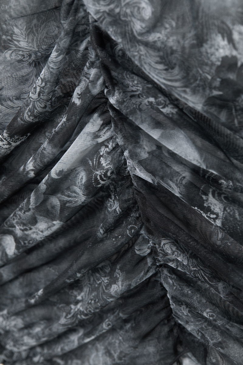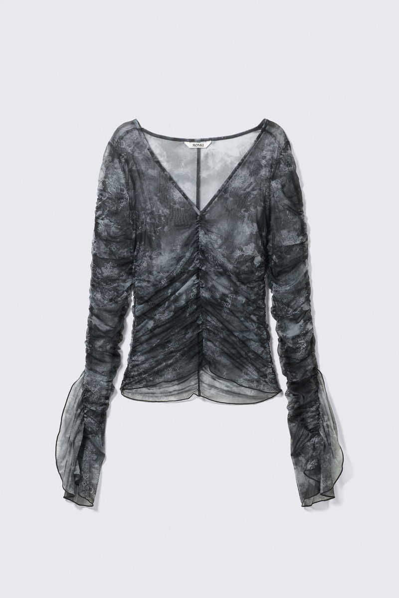 A fitted long-sleeved top crafted from stretchy sheer mesh. Designed with a deep V-neckline, frilled cuffs, and gathered seams through the body and sleeves that create a draped, ruched effect.
