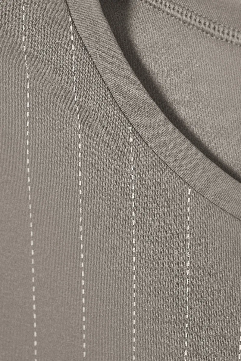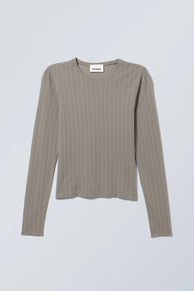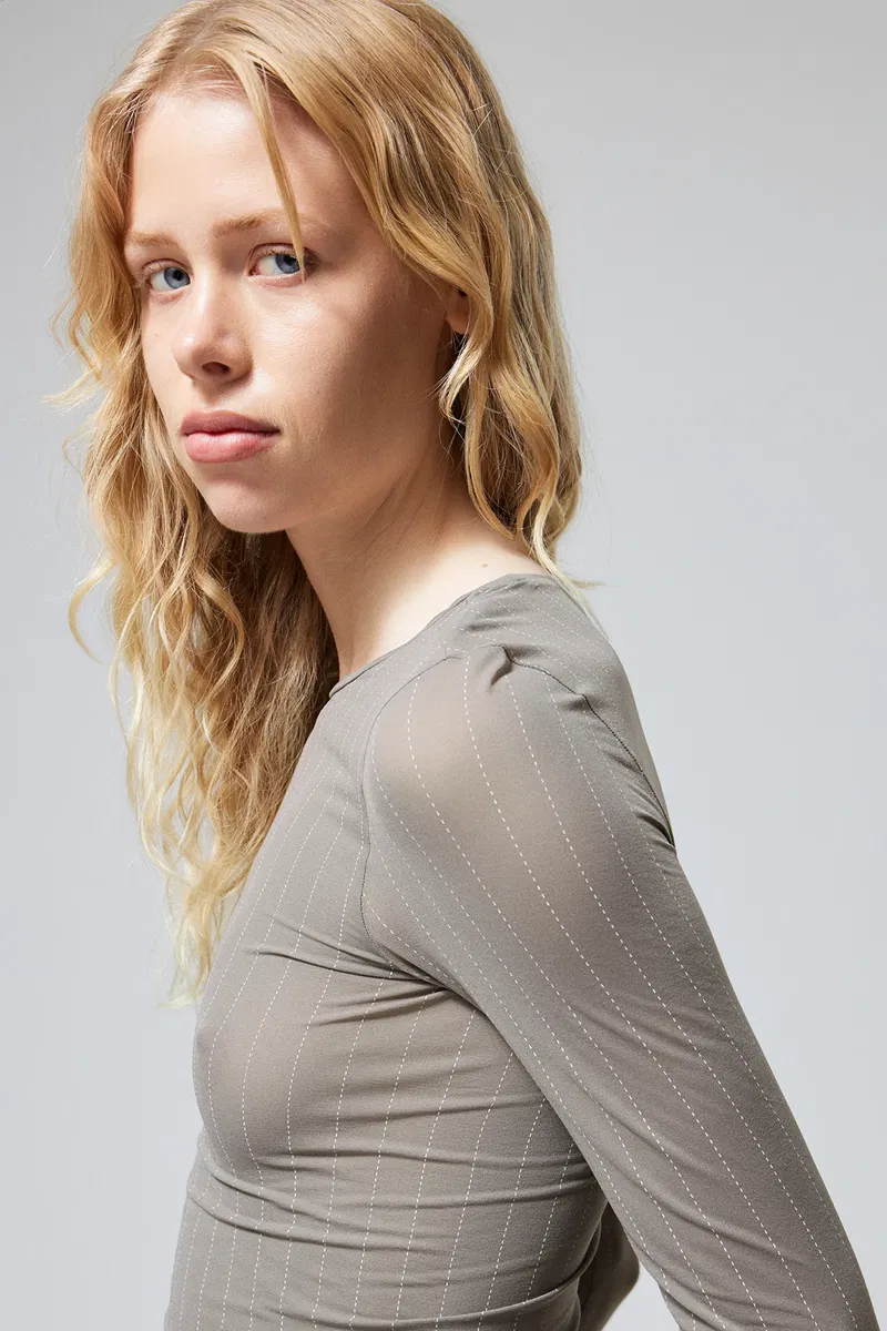 A regular-fit, sheer printed long sleeve top made from a single jersey recycled nylon fabric. This piece has a round, folded neckline, no side seams, and a clean finished hemline.