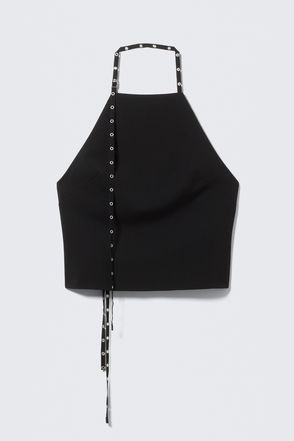 A short halterneck top cut to a slim fit. It features a V-neckline and a corset-like hook-and-eye front closure.