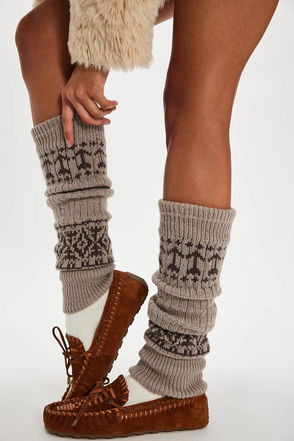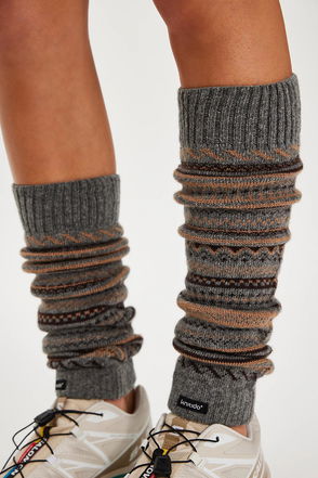 A pair of short rib knitted leg warmers with self-finished edges, made from a soft recycled polyester yarn.