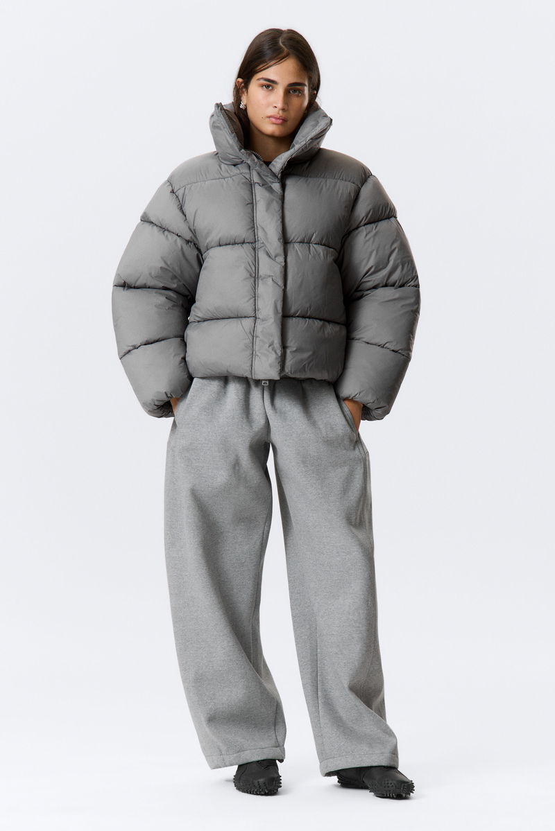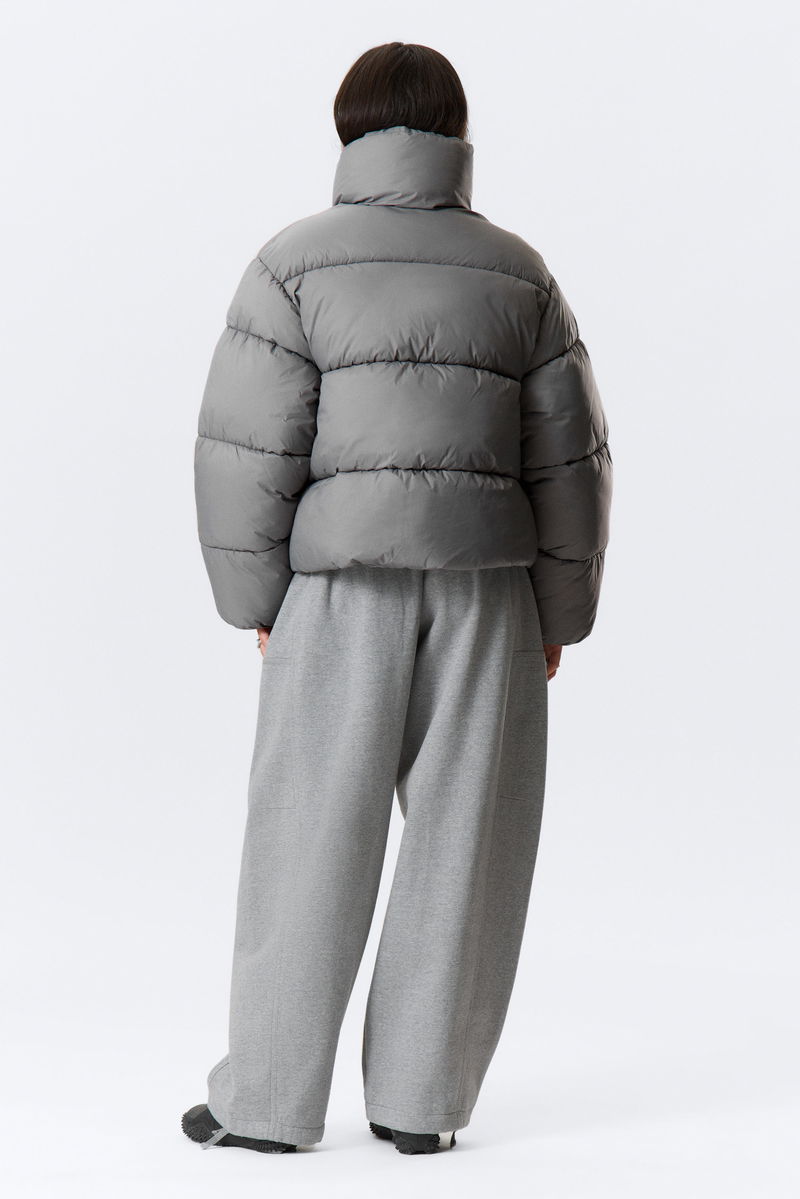 A padded puffer jacket with an oversized silhouette and short length. It features a high stand collar, a two-way front zip concealed by a padded placket with Velcro closures, and side seam pockets shifted slightly forward. Designed with a slightly longer back hem and drawstring details at the hem for adjustable shape. Finished with subtle topstitching and an inside pocket for functionality.