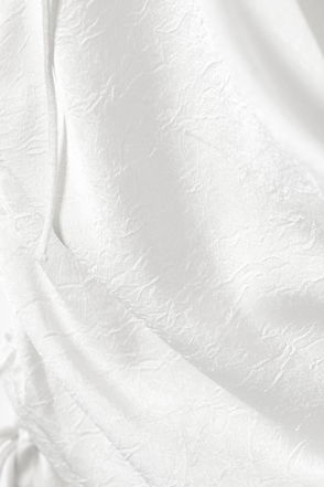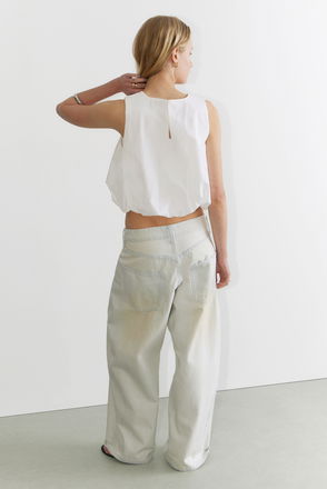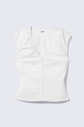 A sleeveless, asymmetric peplum top cut to a slim fit, crafted from cotton twill. It features a round neckline, a wavy button closure, and a frayed hemline.