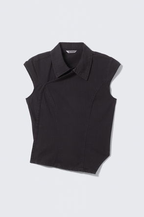 A sleeveless, asymmetric peplum top cut to a slim fit, crafted from cotton twill. It features a round neckline, a wavy button closure, and a frayed hemline.