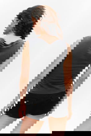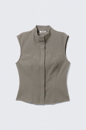 A sleeveless top with a slim fit crafted from recycled polyester and viscose, enhanced with a touch of recycled elastane for extra stretch and comfort. It features a wide neckline, a corset-like hook-and-bar closure, and darts for added structure.