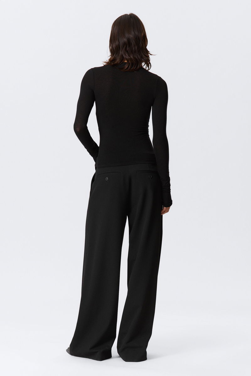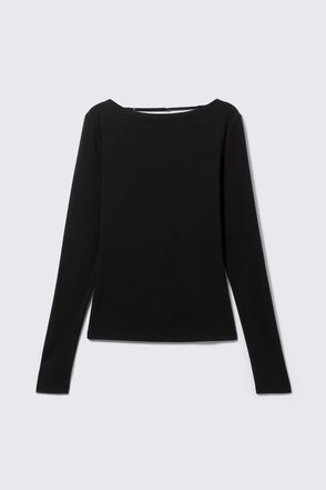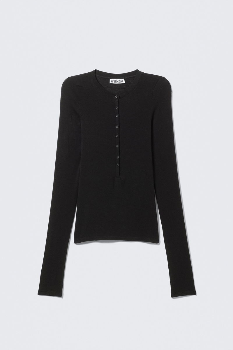 A slim-fitting long-sleeved Henley top crafted from stretchy viscose jersey. Features a round neckline with eight buttons, slightly longer sleeves, and straight hems for a clean, minimal finish.