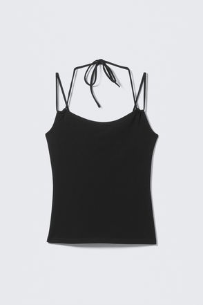 A slim-fit vest top crafted from a stretchy recycled polyester and viscose fabric.