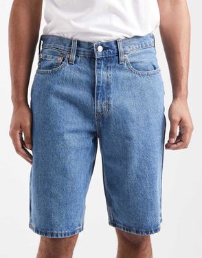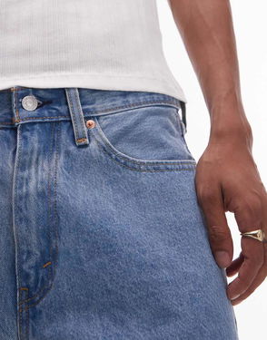 A pair of relaxed, knee length denim shorts made from an organic cotton rigid denim enhanced with recycled cotton. They have a classic five pocket look and folded hems.