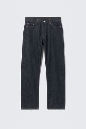 A pair of loose fit straight leg jeans made from an organic cotton rigid denim enhanced with recycled cotton. They have a medium rise with a relaxed fit throughout the hips and seat.