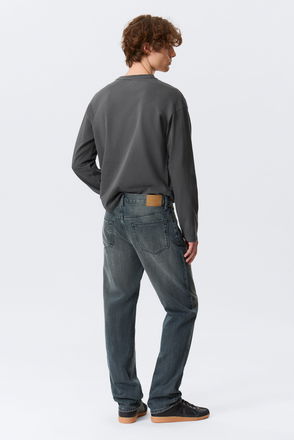 A pair of loose fit straight leg jeans made from an organic cotton rigid denim enhanced with recycled cotton. They have a medium rise with a relaxed fit throughout the hips and seat.