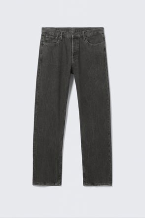 A pair of loose fit straight leg jeans made from a cotton rigid denim. They have a medium rise with a relaxed fit throughout the hips and seat, and a button fly.