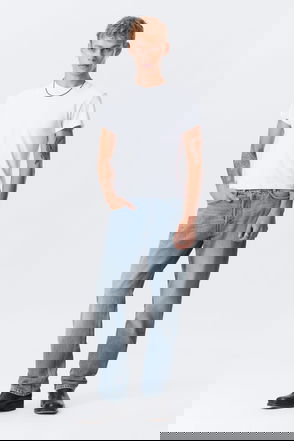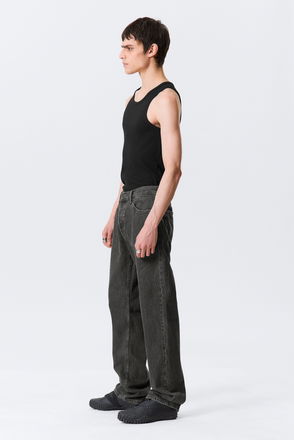 A pair of relaxed fit jeans with a straight leg and long length. These jeans are crafted from organic cotton rigid denim enhanced with recycled cotton.
