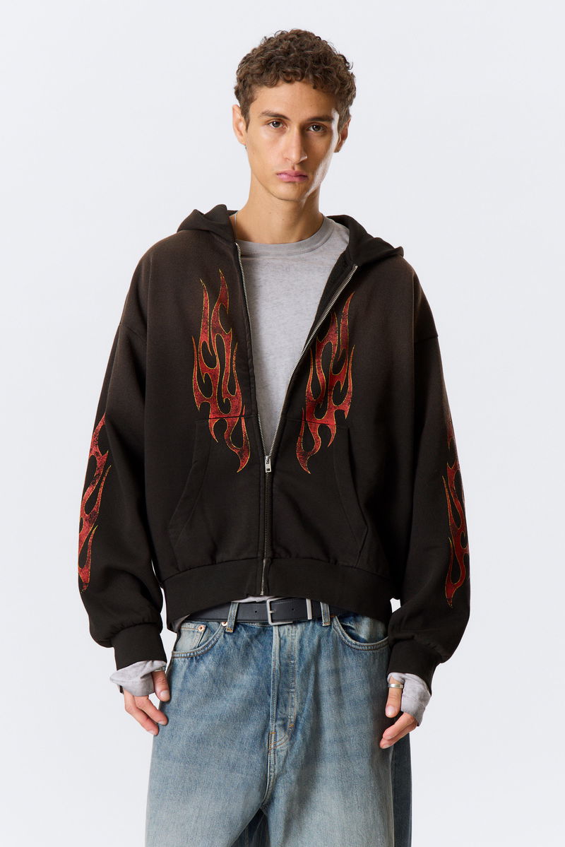 A square-shaped zip hoodie with a relaxed fit and soft hand feel. Crafted from cotton fleece with a brushed inside, it features a double-layered hood, dropped shoulders, and a metal zip front. Designed with kangaroo pockets, gathered cuffs and hem, and a structured yet laid-back silhouette.