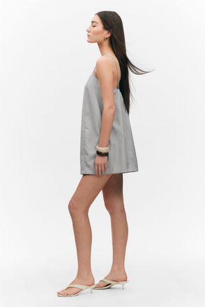 A slim-fit short-sleeve mini dress crafted from recycled polyester and viscose, with a touch of elastane for added stretch and comfort. This dress features a square neckline, short cap sleeves, vertical bust darts for a structured fit, and a concealed side zip.