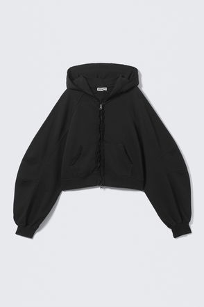 A cropped square-shaped oversized hoodie made from soft cotton terry enhanced with recycled polyester. This go-to layer has a double-layered drawstring hood, dropped shoulders, gathered ribbed cuffs and hemline, and a kangaroo pocket.