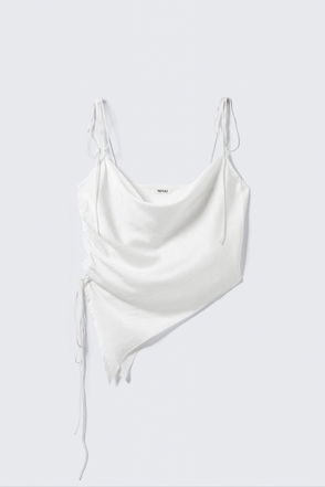 A one-shoulder crop tank top made from an organic cotton rib jersey with a touch of elastane. It has a cutout look on the shoulder and ribbed hems.