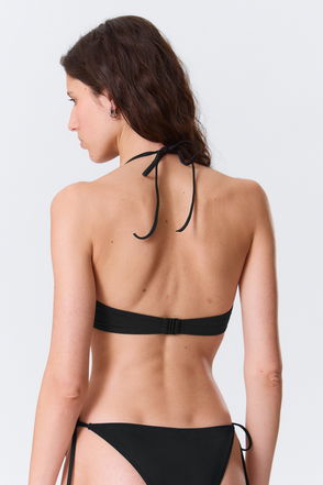 A minimal coverage strappy bikini top made from a stretchy recycled polyester enhanced with elastane for extra comfort. This strappy favourite has thin spaghetti straps that run through tunnels at the top and in the back finishing in a halter-neck top tie closure and a tie back closure.