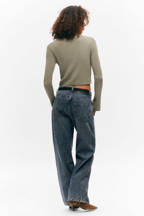 A slightly cropped ribbed knit cardigan made from a soft recycled polyester & polyamide yarn enhanced with RWS wool, RMS Mohair with a touch of recycled elastane for extra flexibility. It has a boxy cut and a roomy fit with a v-neck with three medium sized buttons, and full-fashioned ribbed knit design in the front.