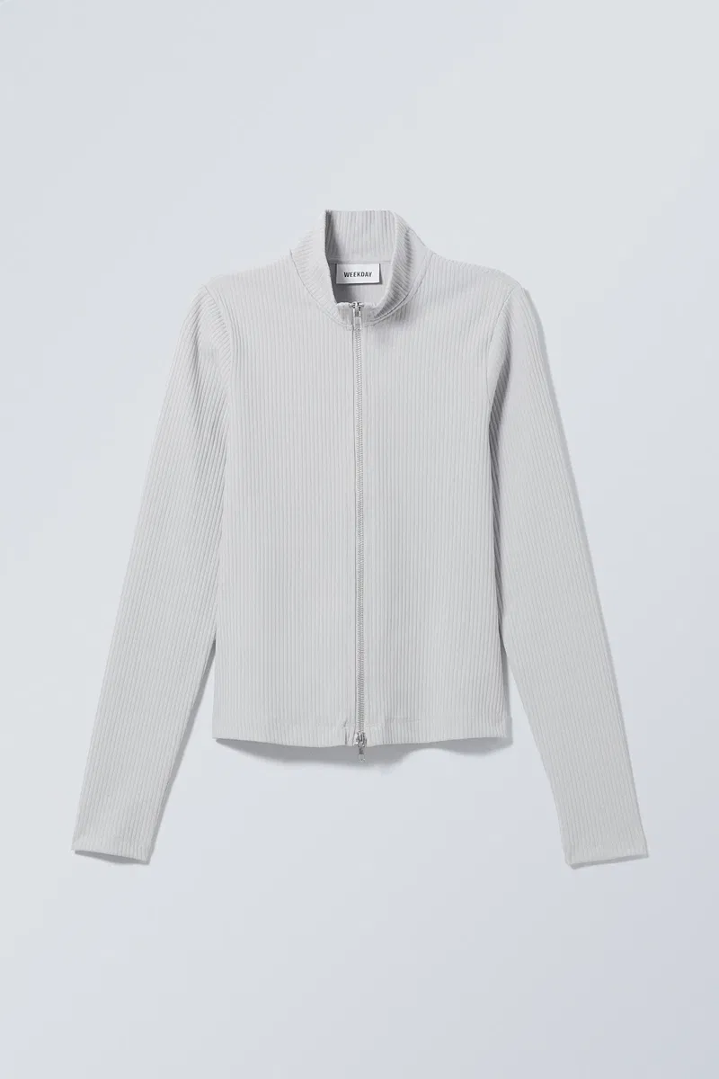 A body hugging ribbed zip long sleeve made from a soft cotton jersey with a touch of recycled elastane for extra stretch and flexibility. Details include a sturdy two-way front zip, a double-layered turtleneck collar, and folded hems.