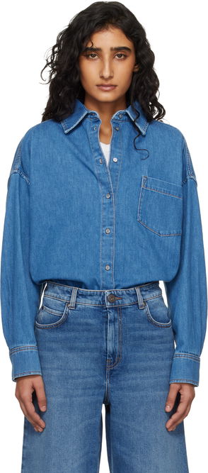 Lightweight stretch polyester- and virgin wool-blend gabardine shirt. · Spread collar· Button closure· Flap pockets· Cropped tennis-tail hem· Dropped shoulders· Pleated single-button barrel cuffs.