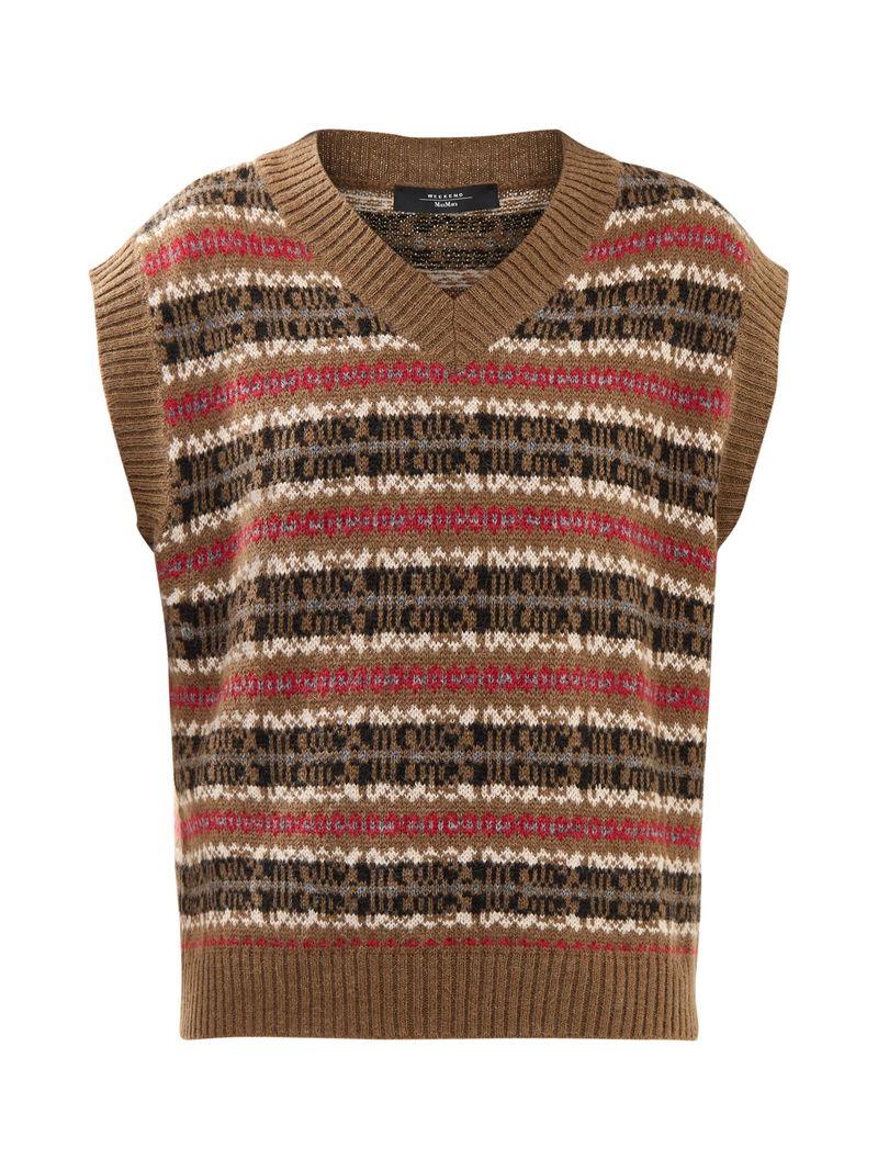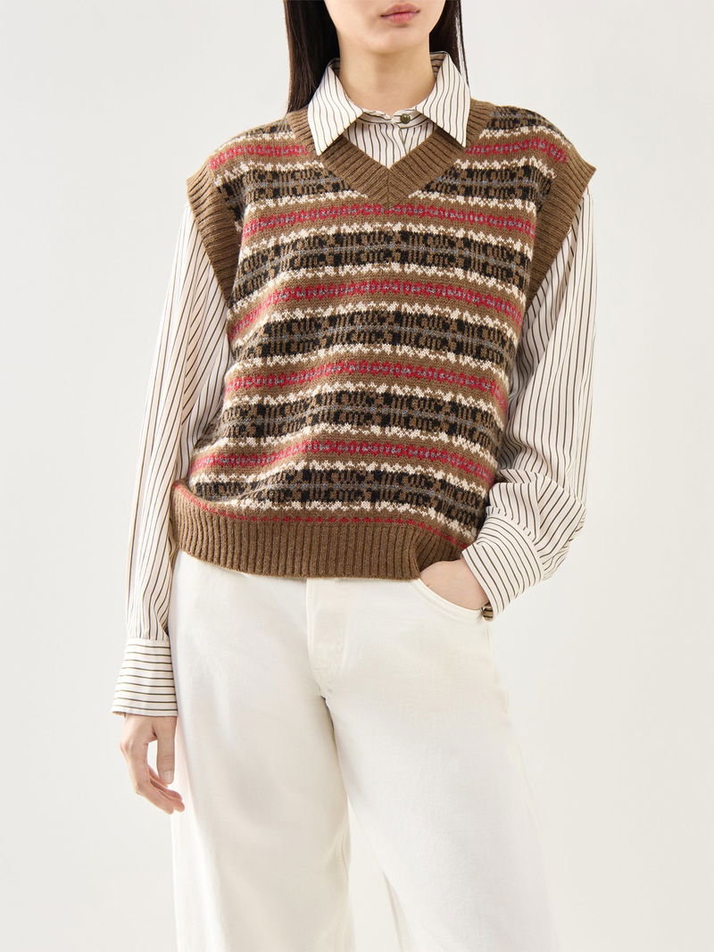 The Fleres Knitted Fairisle Vest combines classic Fairisle patterns with a comfortable knit fabric, making it a versatile layering piece.