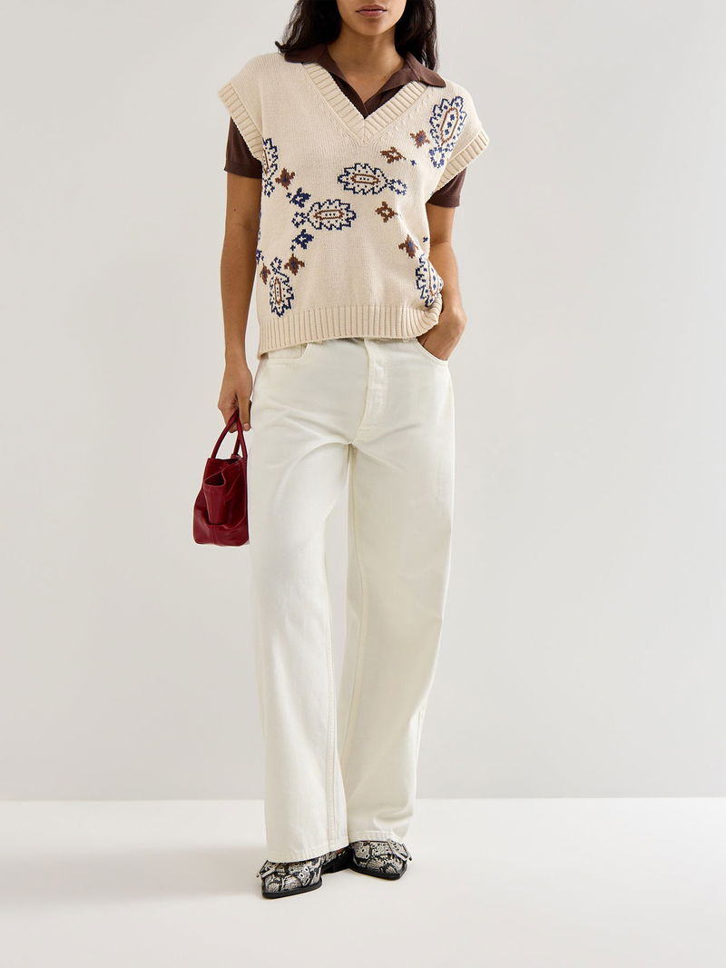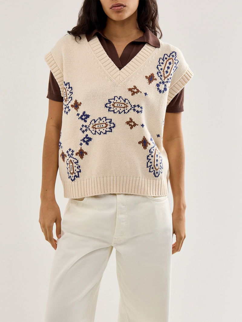 This Weekend Crusca waistcoat features a distinctive bandana print, combining classic knitwear comfort with a stylish pattern.