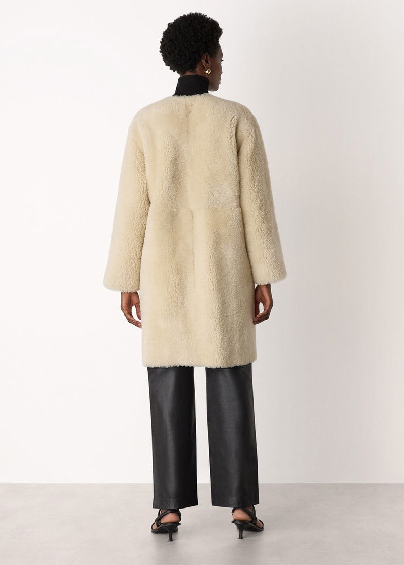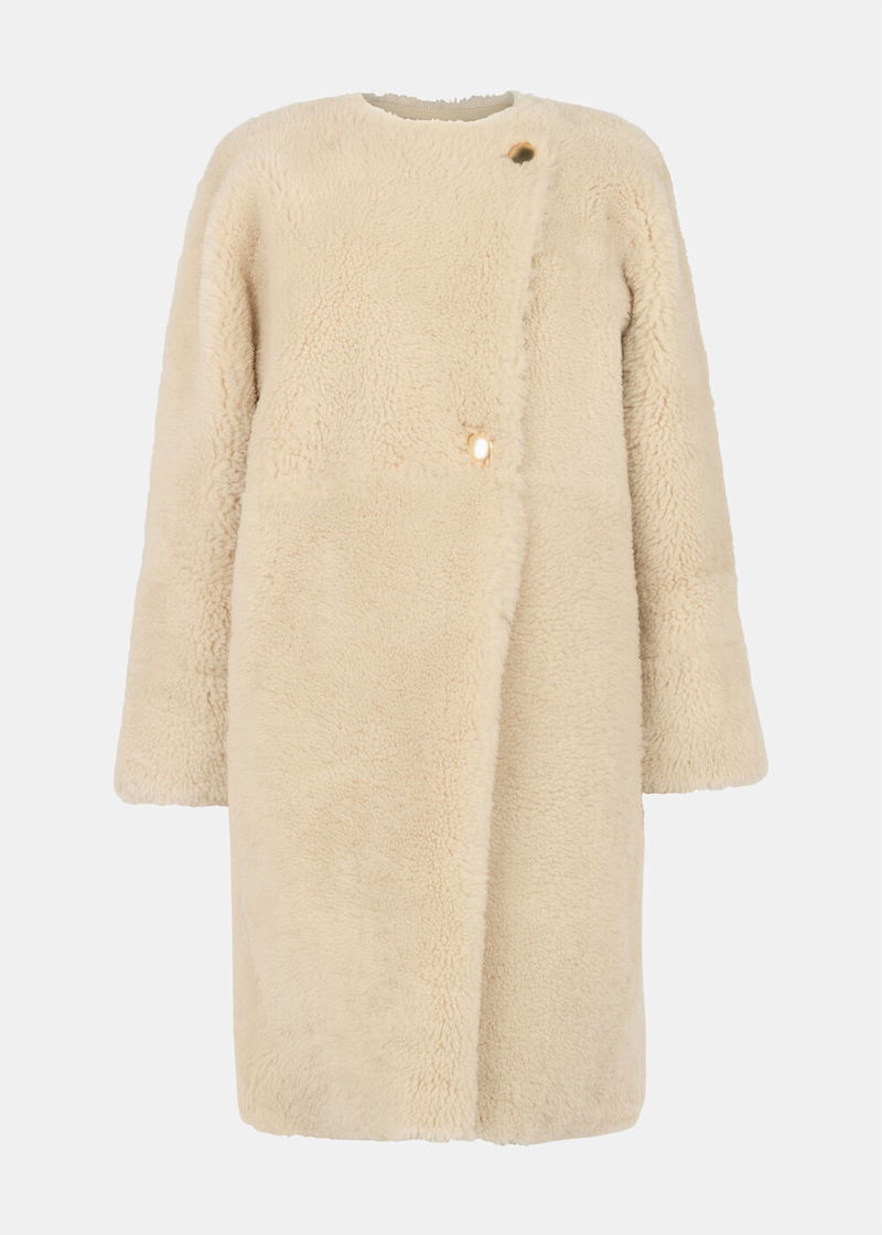 This season, make a statement with our Shearling Cocoon Coat — a warm, sophisticated layer for autumn-winter. Chic and timeless, it’s crafted in a soft beige shade from premium shearling, with a cocoon silhouette and gold-toned oval buttons for a refined touch. Whether you’re dressing for daytime or heading out in the evening, this is the versatile coat your wardrobe has been waiting for.