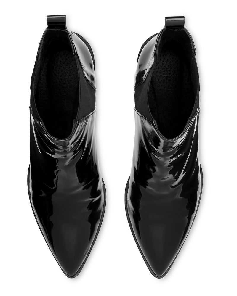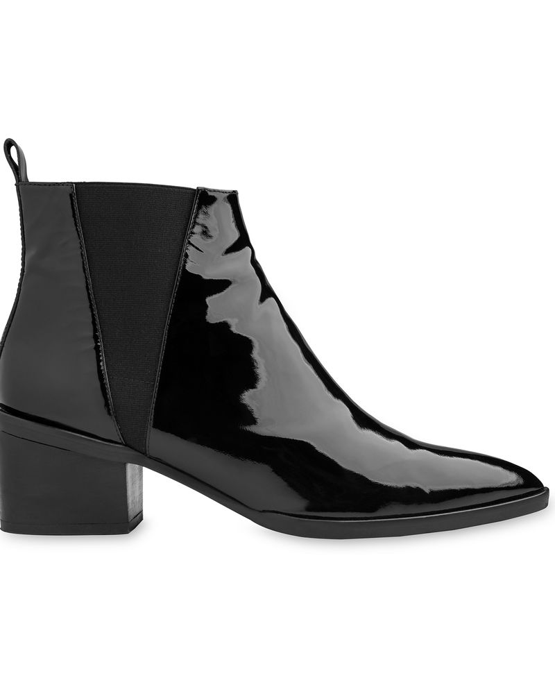 The Chelsea boot is a versatile footwear style, reimagined this season in smart patent black leather. The pointed silhouette and gloss finish will add a beatnik edge to your look. We wear ours with distressed cropped denim, or to add edge to a classic black dress.