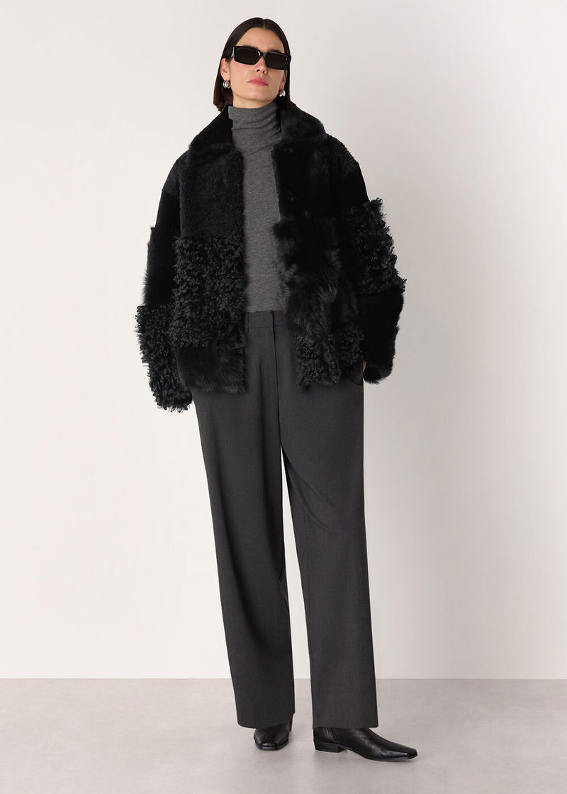 Make a bold statement with this luxurious shearling jacket in a classic shade. The design showcases a striking patchwork of sheepskin in varying textures and lengths for a stunning effect. Featuring a loose fit, wide sleeves, inserted pockets and a hook-and-eye fastening, it pairs effortlessly with smart tailoring or off-duty denim.