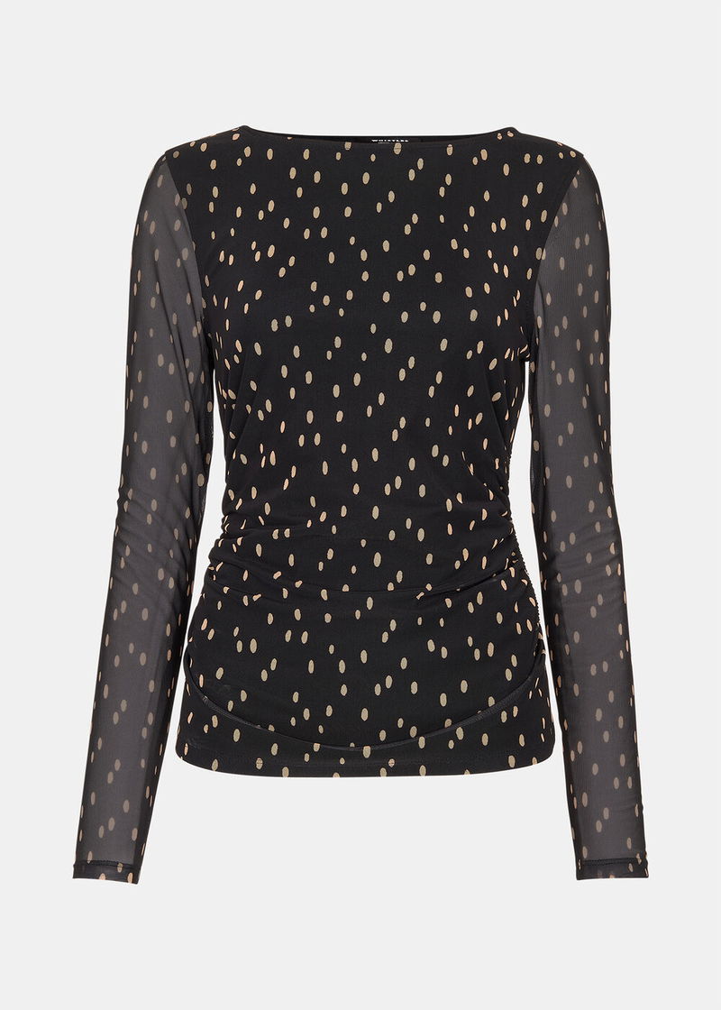 Here at Whistles, we design tops that move effortlessly between moments — and our Spot Print Mesh Jersey Top is the perfect desk-to-dinner example. In black with contrasting yellow spots, it features delicate mesh sleeves, a lined body, and flattering ruched sides. Transition seamlessly between settings, keeping the same refined look.