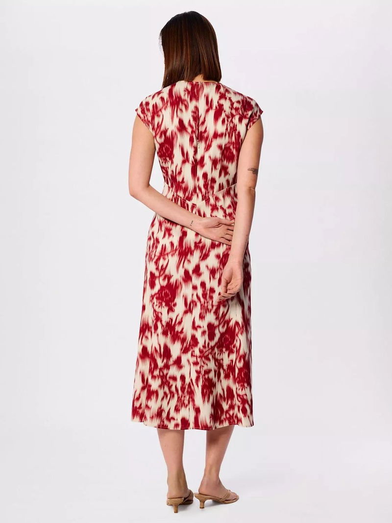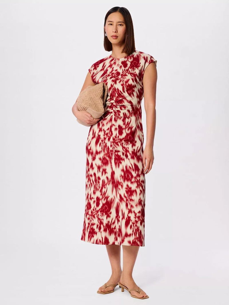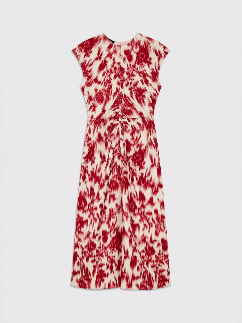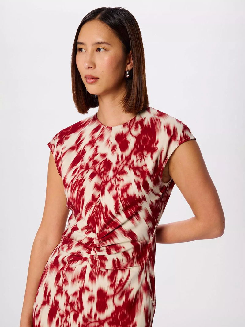 This midi dress brings a fresh twist to occasion dressing with its ruched A-line shape and lively floral pattern. The sleeveless design keeps you cool while the round neck and viscose blend fabric offer comfort whether mingling or moving.