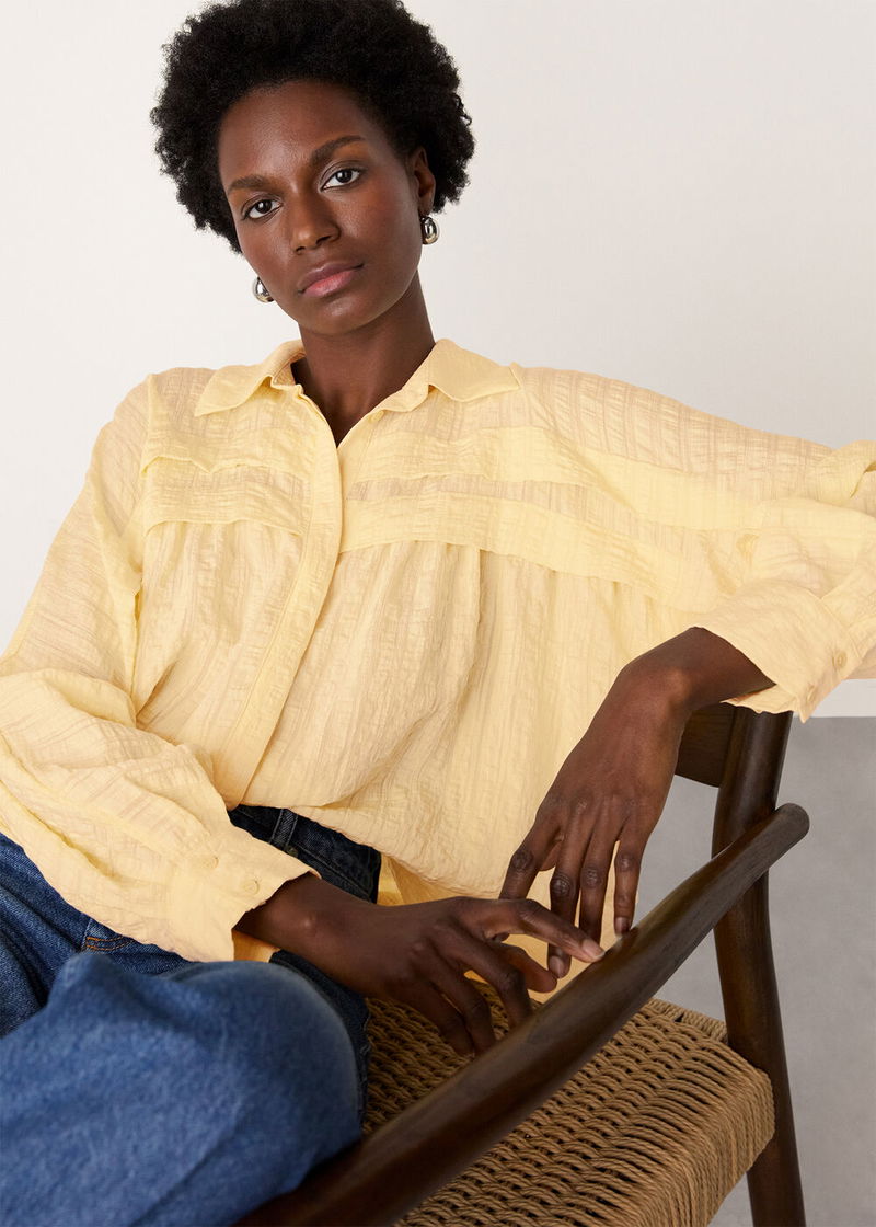 Looking to add a pop of colour to your wardrobe? The Textured Frill Detail Blouse is the perfect place to start. Crafted in a butter-yellow shade with a softly textured finish, it’s a standout piece you’ll reach for time and again. Designed with frill detailing at the front, blouson sleeves, a classic collar, and button fastening; style it with your favourite jeans for an effortless daytime look, or pair it with tailored trousers to elevate your outfit.