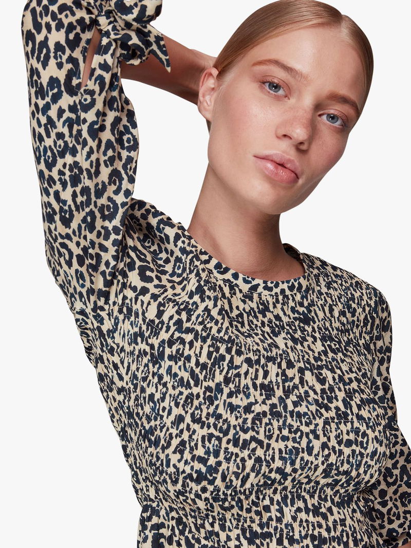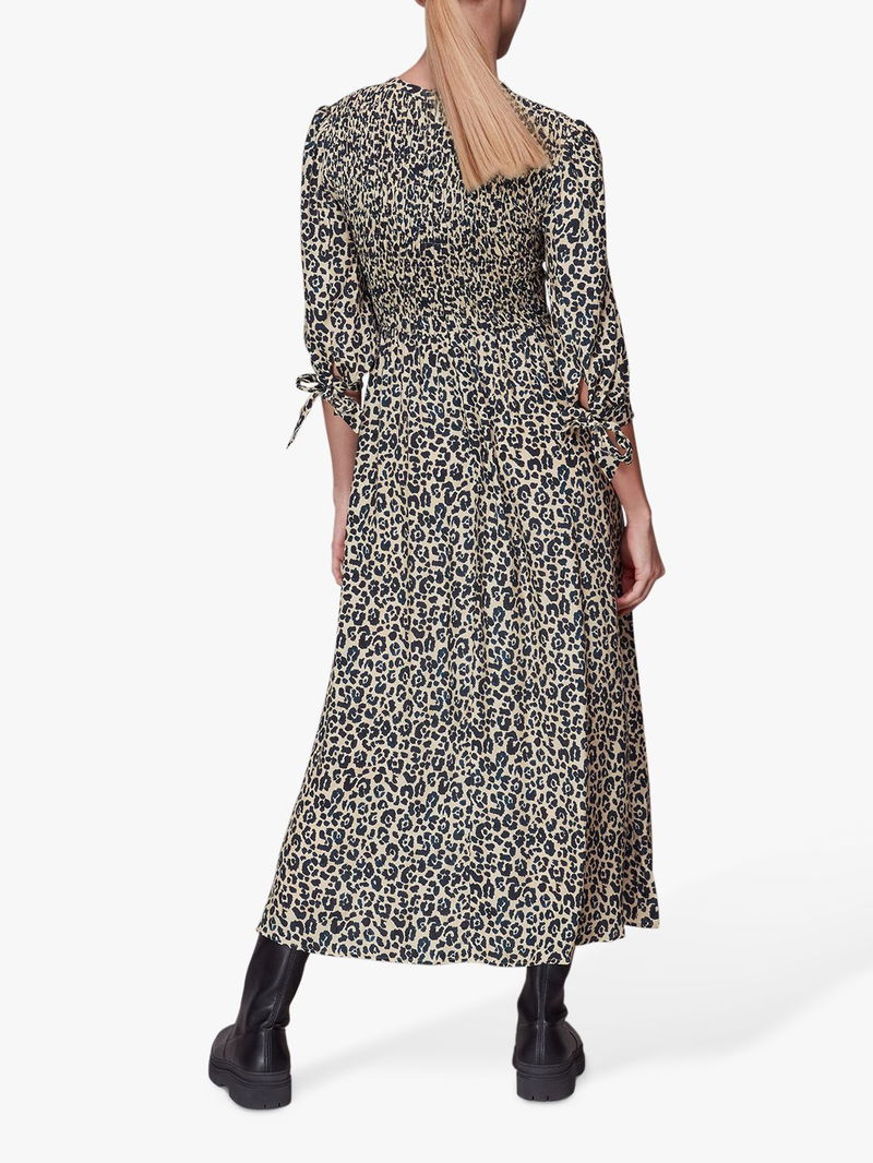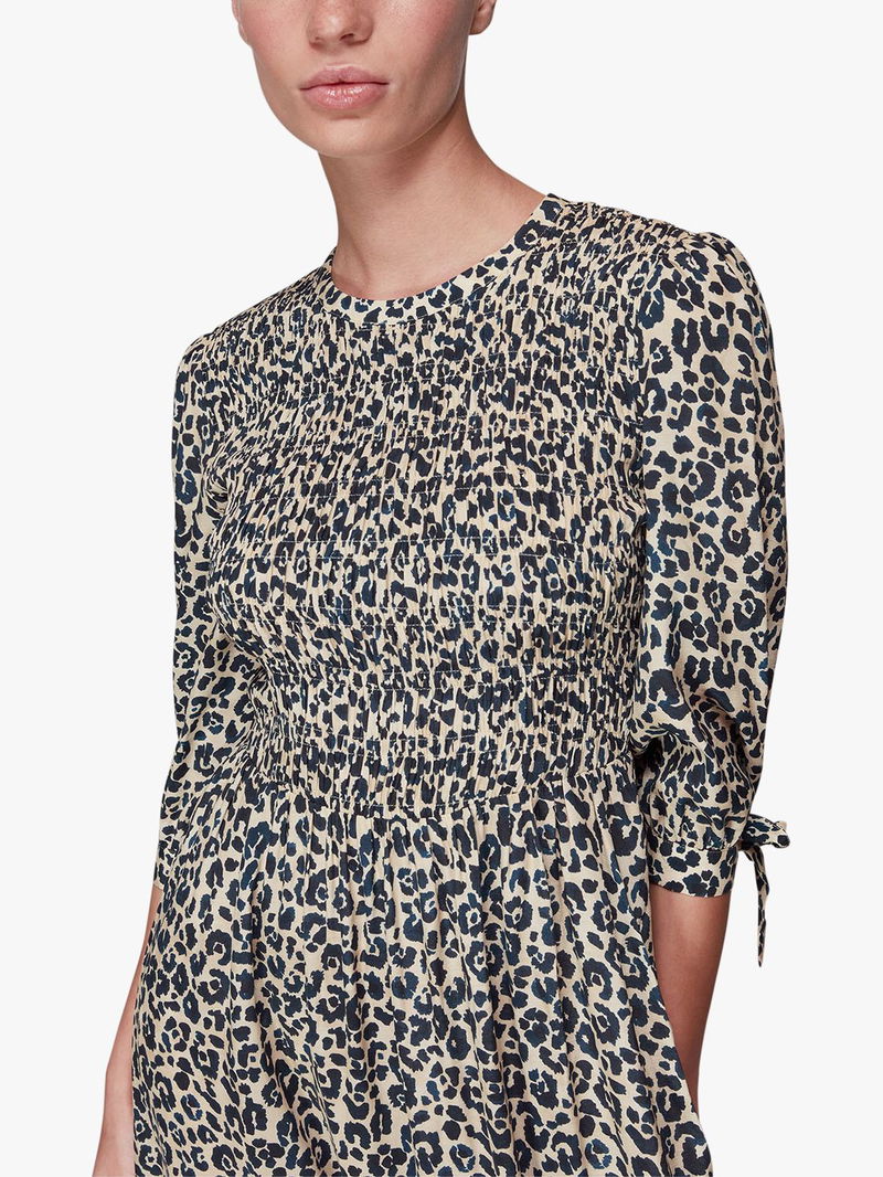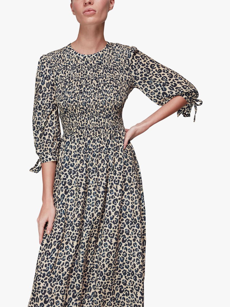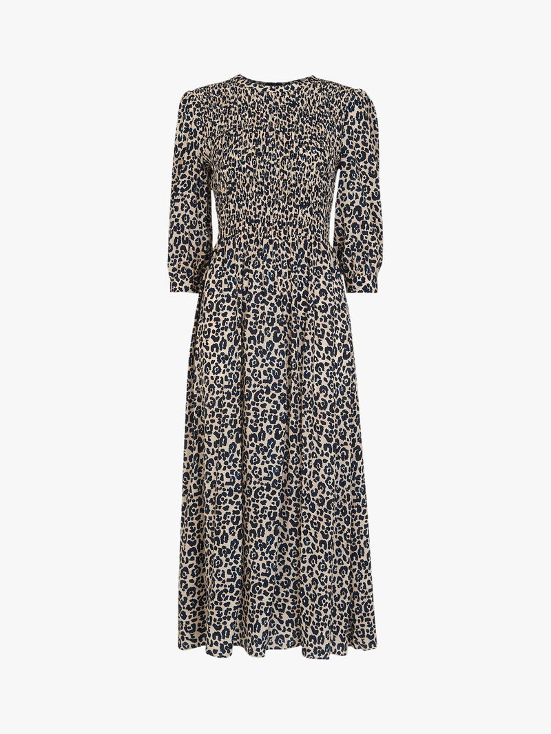 Flaring out at the hem for a feminine silhouette, this midi dress by Whistles is decorated with a wild animal print. Framed with a round neckline and three-quarter length sleeves, this piece will have you covered all hours of the day; boardroom and bar alike.