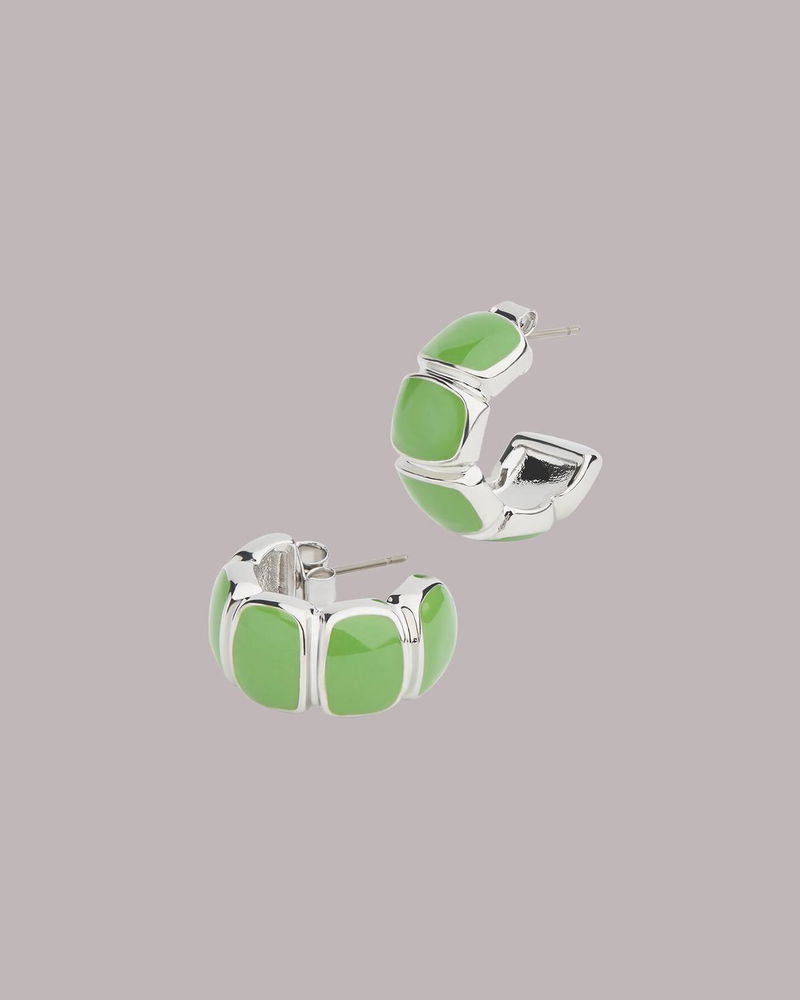 Cast from a high-shine, silver-coloured metal, and decorated with a vibrant green enamel, these earrings lean into fun, current jewellery trends. Push back your hair to show them off with whatever outfit you choose to style them with.