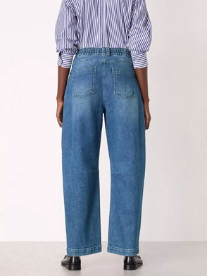 Cut from denim, these jeans sit high on the waist and have an exaggerated barrel-leg silhouette that falls at the ankle. Tuck in a shirt or jumper in a vivid colour to emphasise your waist. We love wearing ours with everything from contemporary trainers to heeled ankle boots. This is a looser fit jean and if a close fit is required, then we'd suggest sizing down.