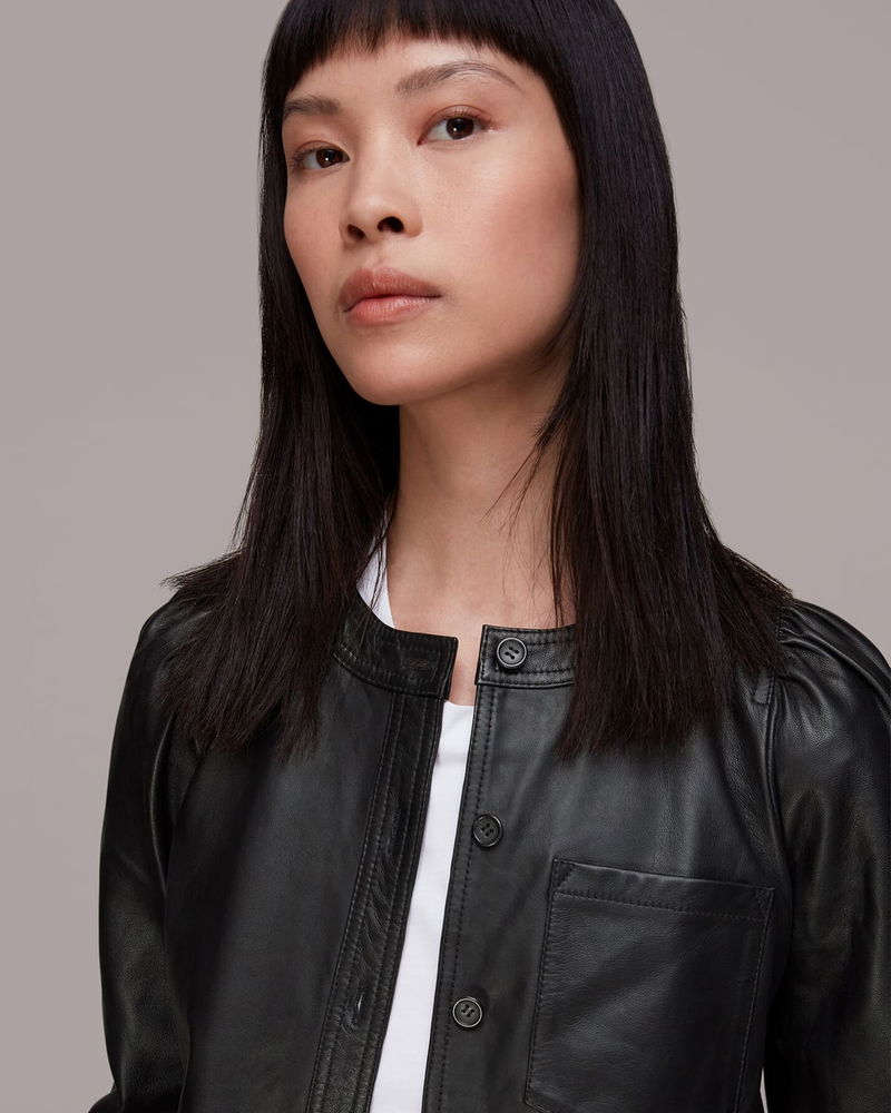 Cut from leather, this style is a classic shirt shape with gathered sleeves. Style with jeans and white t-shirts for a look to take you anywhere.
