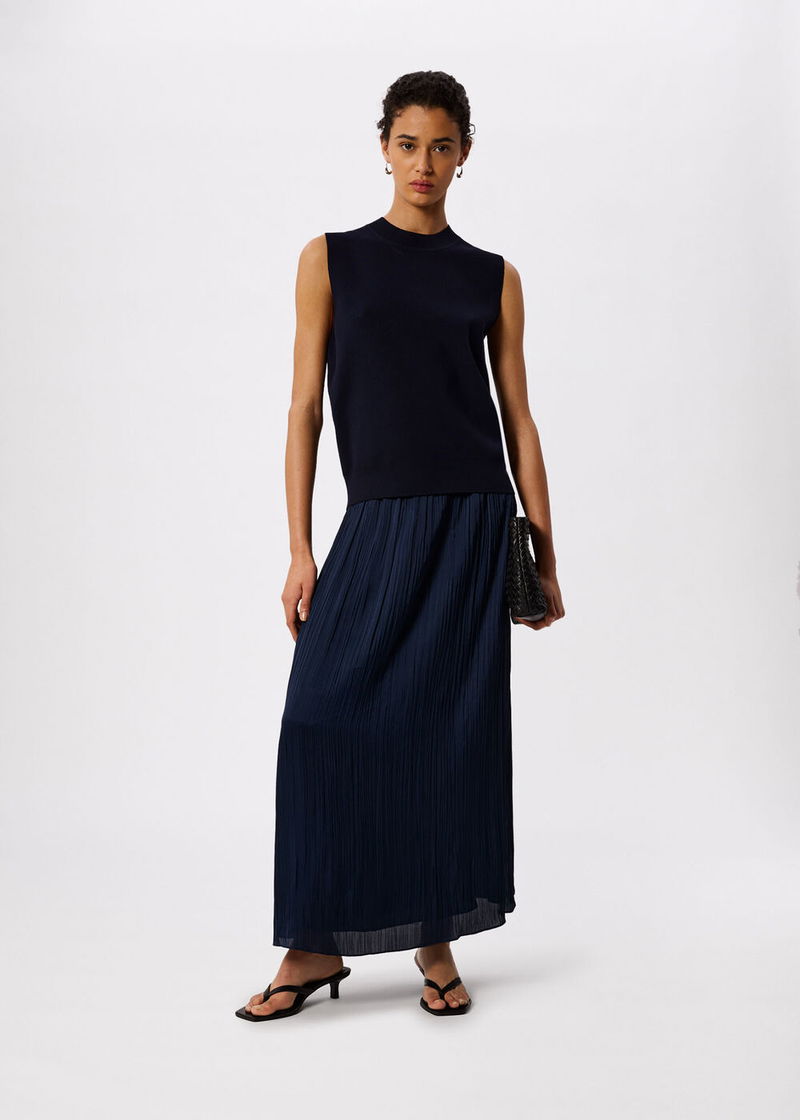 Navy Plisse Column Midi Skirt