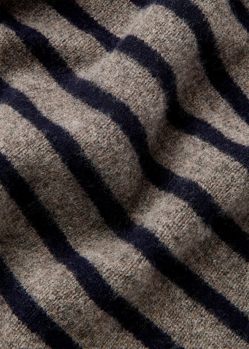 Our knitwear collection, designed as versatile, everyday staples, makes styling effortless. The Wool Stripe Crew Neck Knit is a must-have for easy, casual looks, with its relaxed, boxy fit, classic round neckline and black stripes that contrast its neutral grey base.