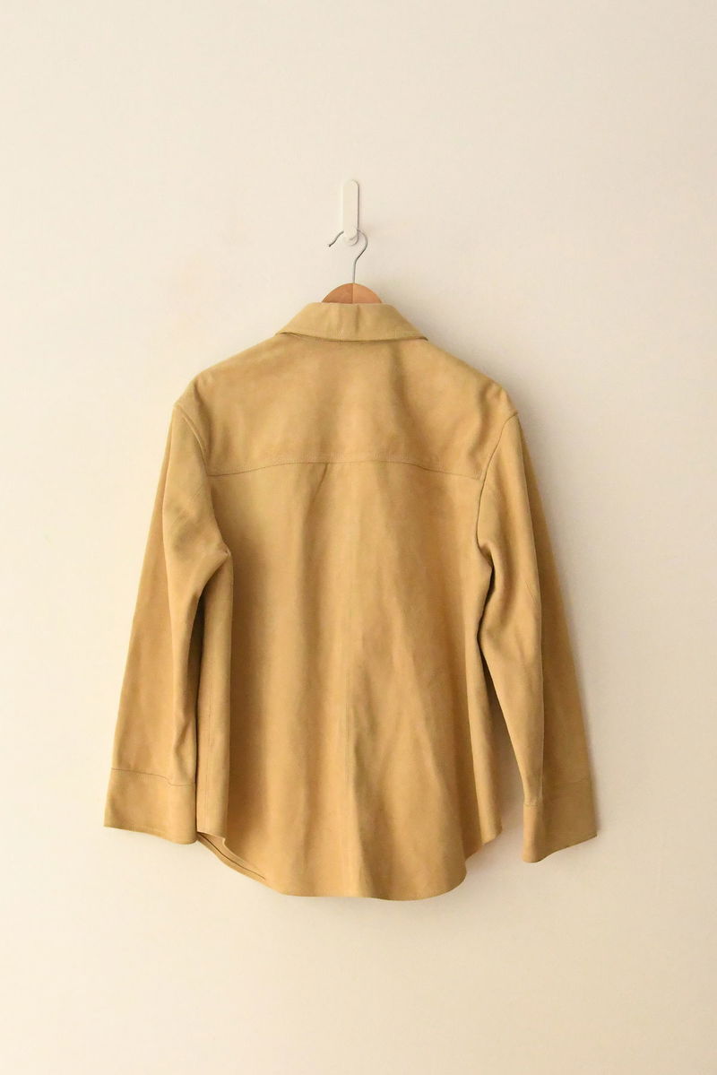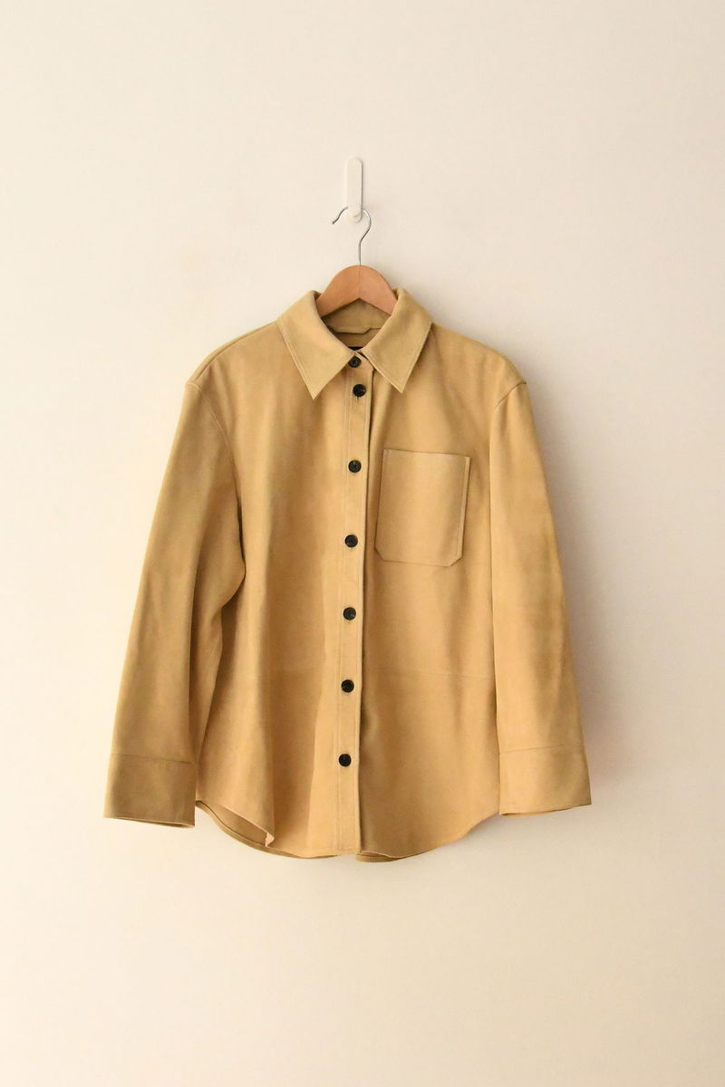 It’s crafted from neutral suede and designed for a clean, understated look, with a classic collared neckline, oversized front pocket, and button fastening. A wardrobe staple, it promises to accompany you from brisk mornings to sunlit afternoons with ease.