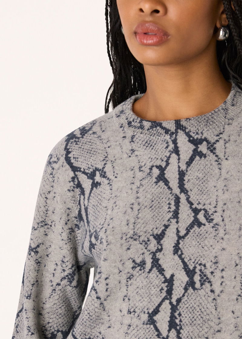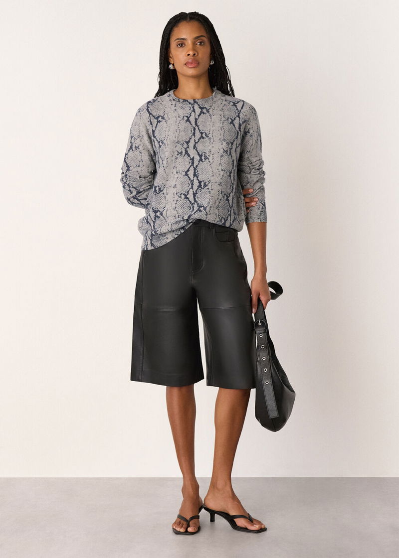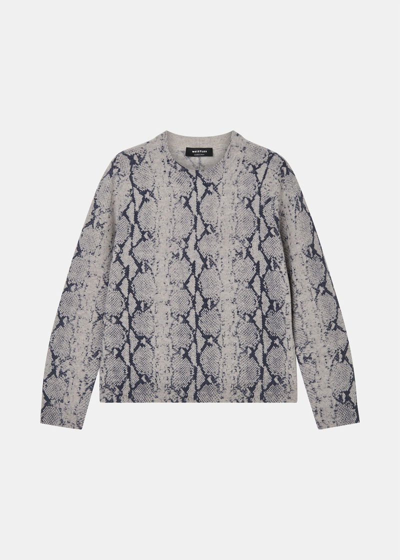 Print meets knitwear with the arrival of our Wool Crew Neck Knit. Designed to bring character to your wardrobe, this jumper features a snake print in a grey shade that highlights the pattern beautifully. Crafted with a classic round neckline, it’s the perfect piece to style with leather bottoms or tailored trousers for a modern, elevated look.