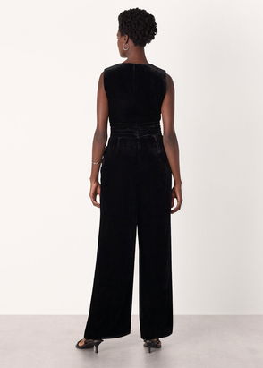 This jumpsuit can be dressed up and down with ease. The tie-front detail cinches in the waist to create a timeless silhouette, whilst the black shade offers much versatility. Wear it with gold or silver jewellery, black boots and heavy outerwear for an on-trend winter style.