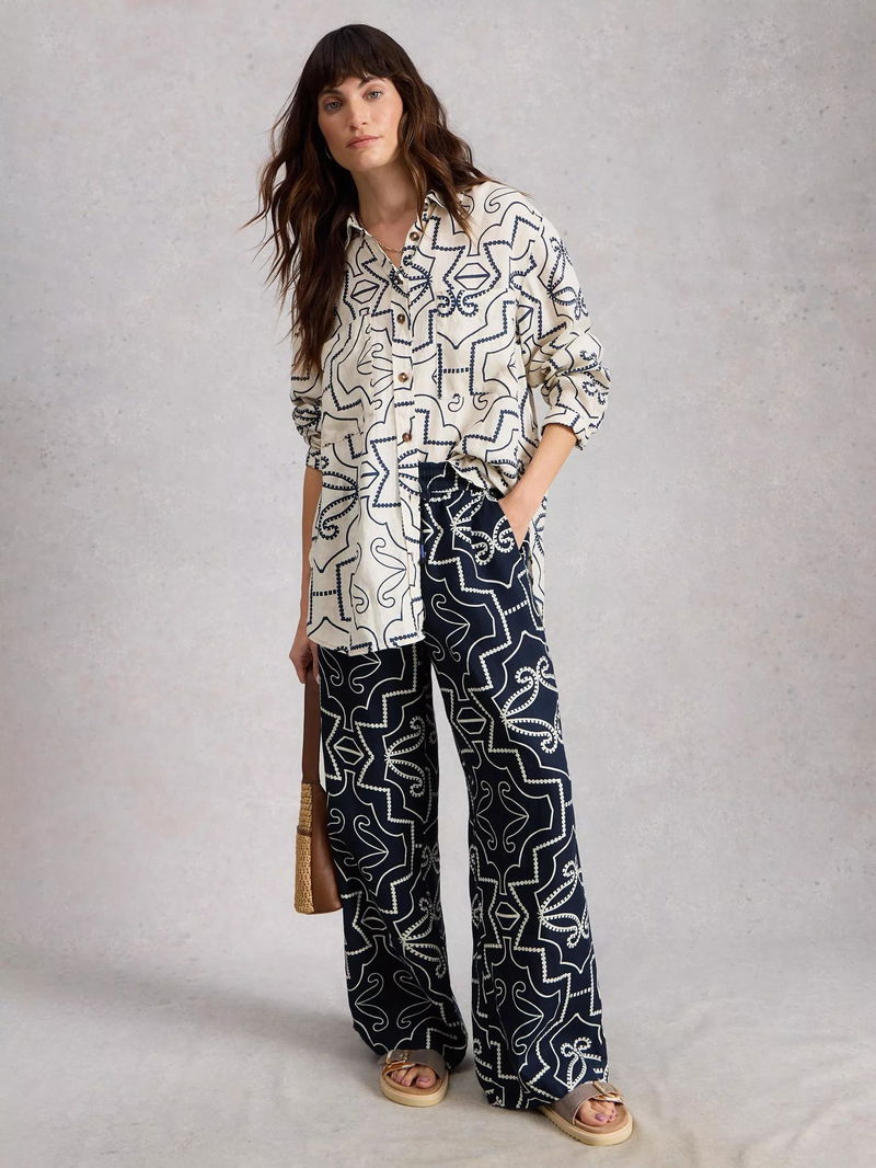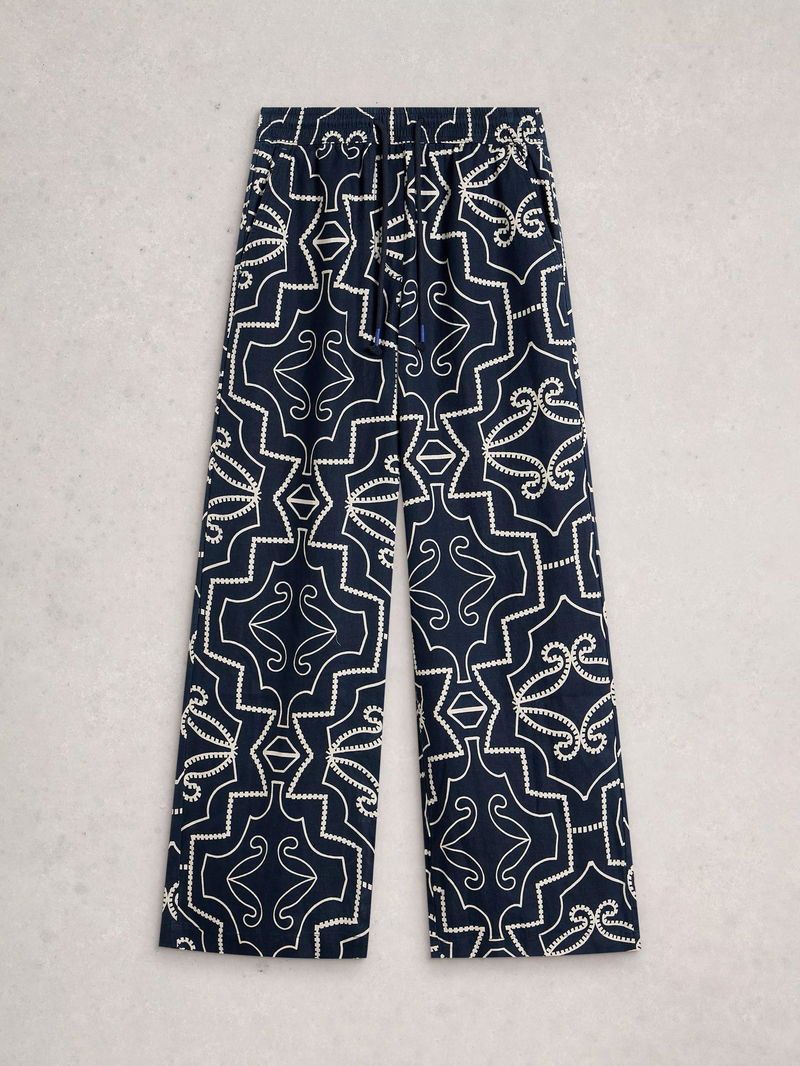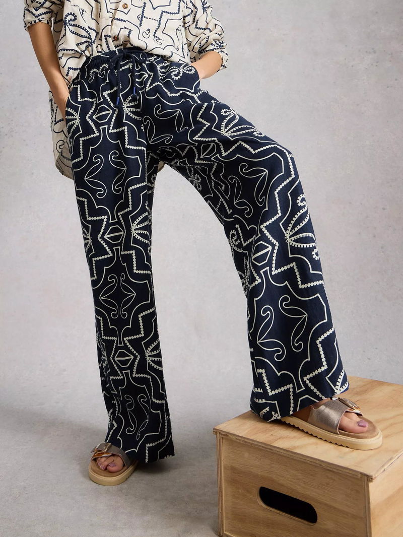Ally Abstract Pure Linen Trousers, Navy/White