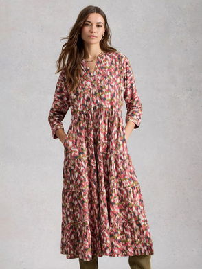 In an easy to wear A-line shape, this knee length dress from White Stuff is light and natural thanks to its pure linen fabrication. Effortlessly flattering thanks to a fuss-free v-neckline and elbow length sleeves, this style is splashed with an abstract print.