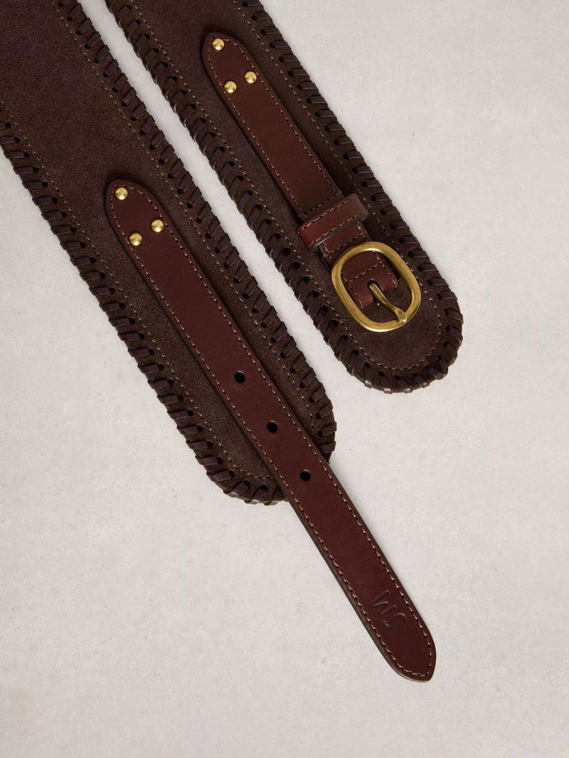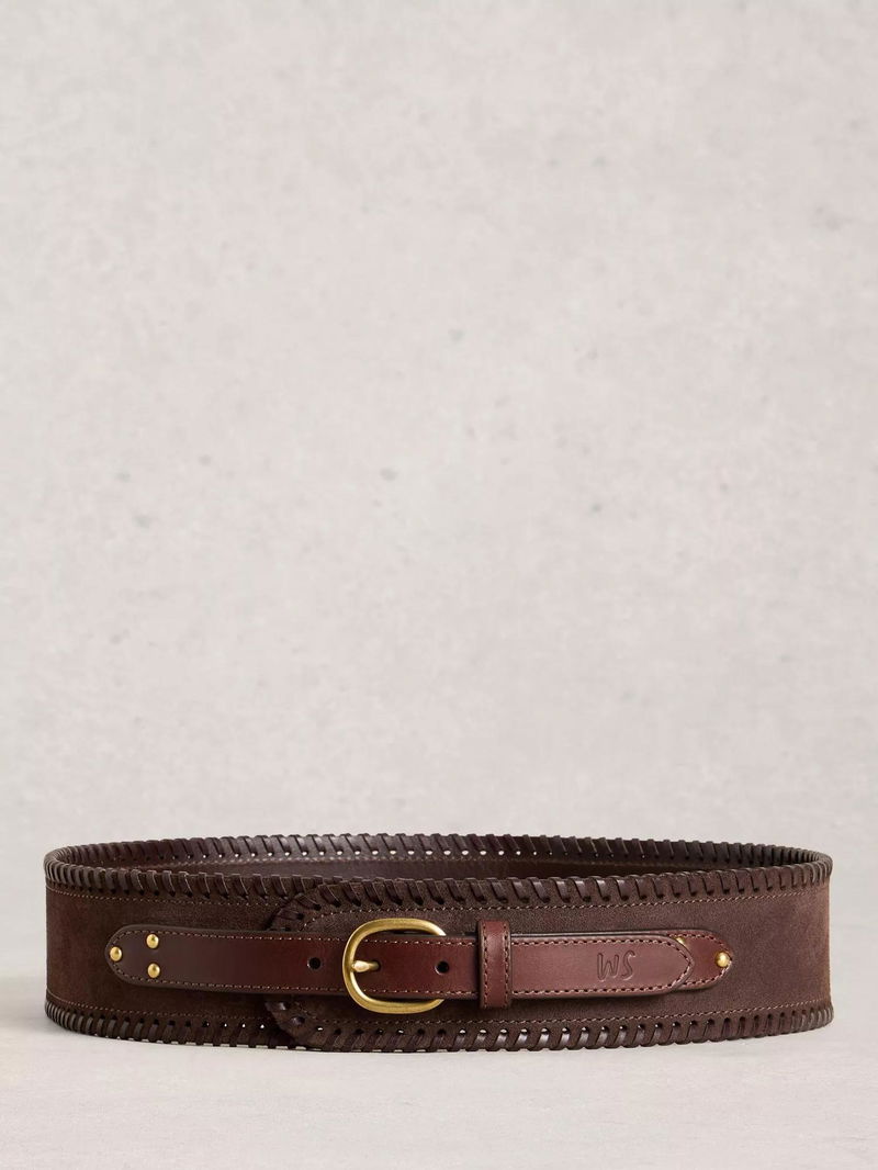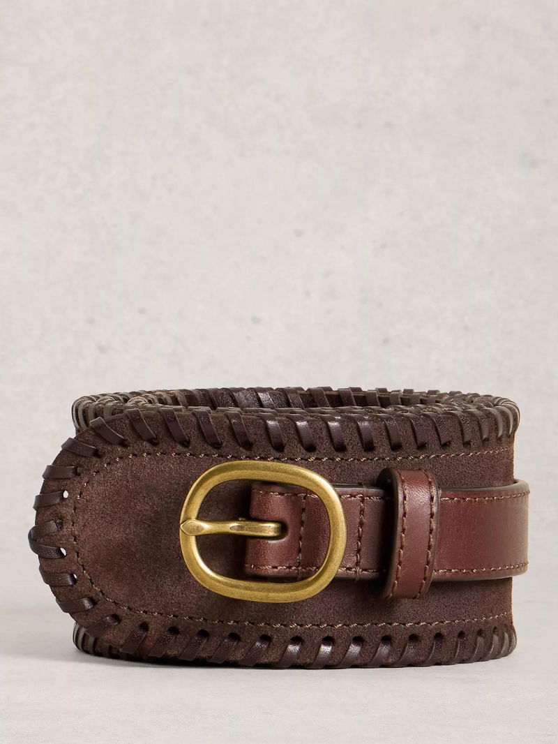 A thick waist statement cinch belt with whipstitch detailing and atinque metallic finished hardware.