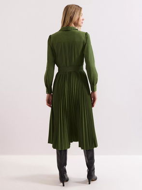 A tiered skirt button up front dress with ruffled detailing on tiers and neckline.