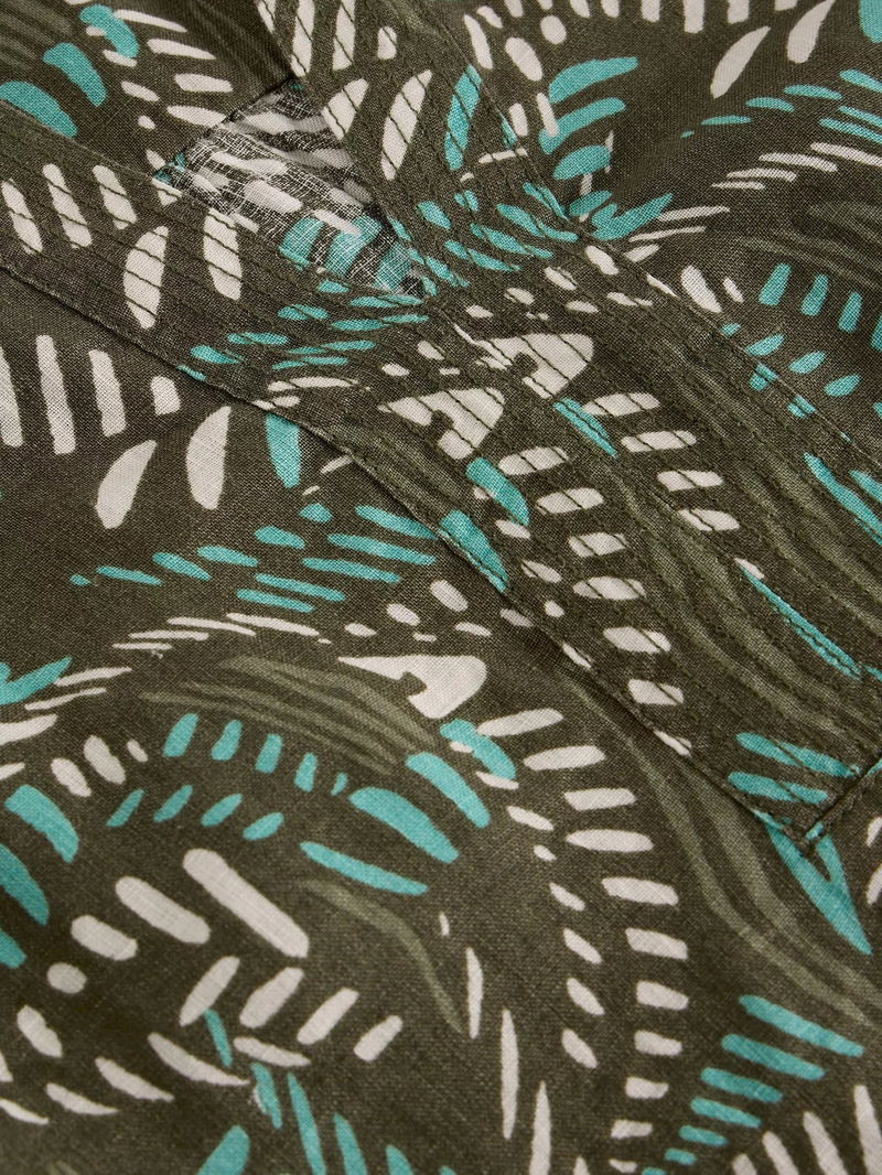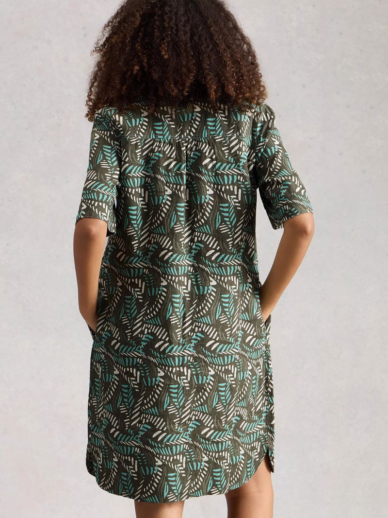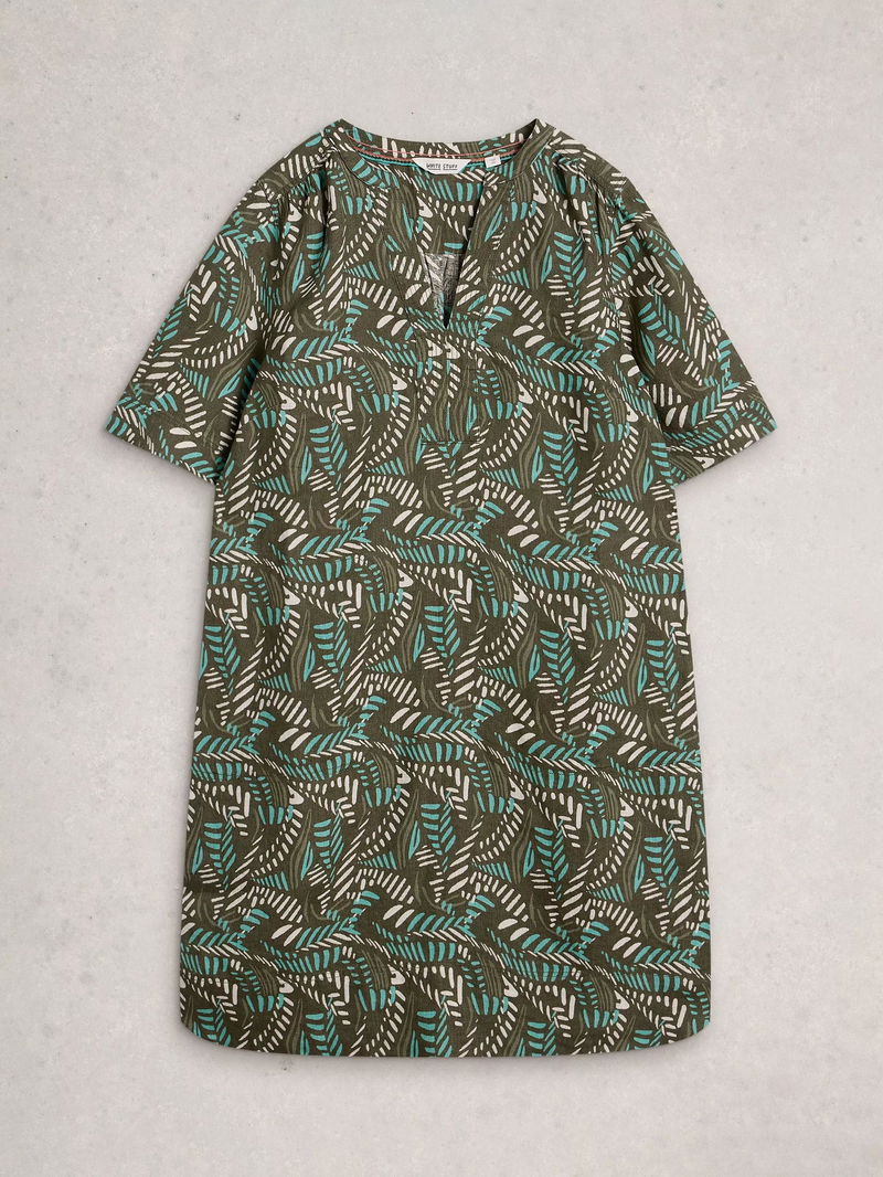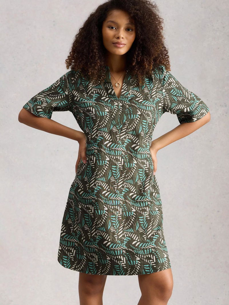 When in doubt, opt for a straight cut silhouette. This elbow sleeved linen knee length dress from White Stuff is framed with a V-neck and a pattern inspired by nature.