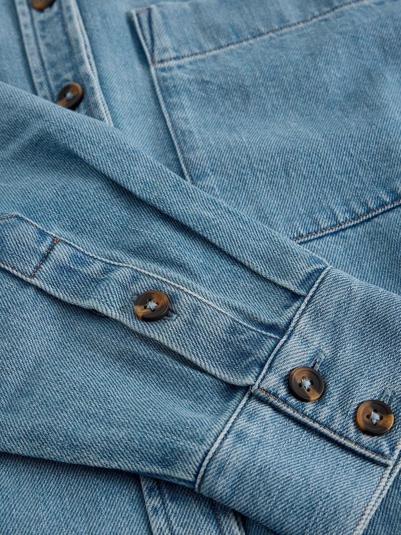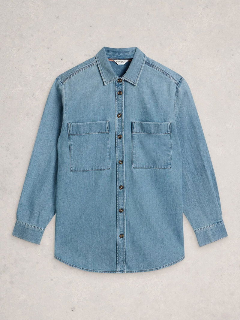 A denim shirt features a classic collar, button-down front, long sleeves, and twin chest pockets.