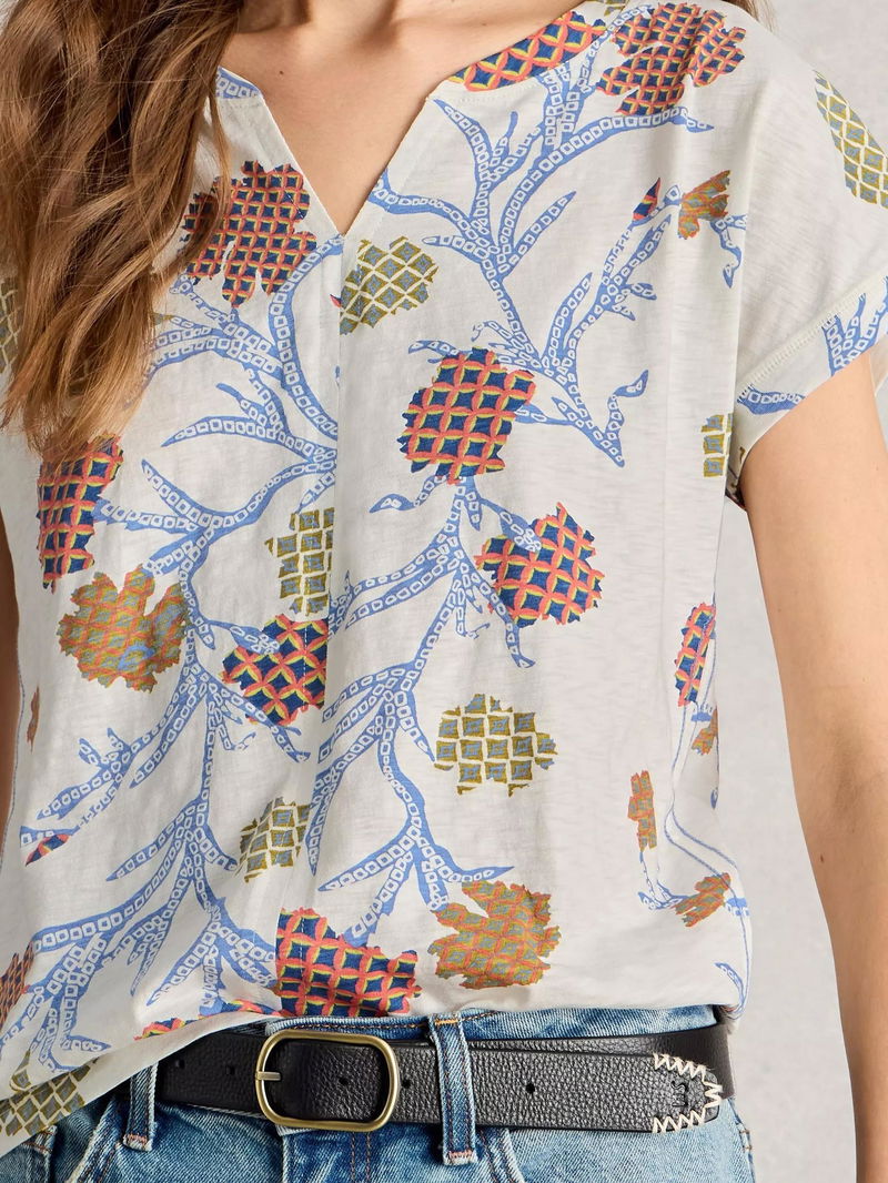 Nelly Cotton Notch Neck T-Shirt, White/Multi
