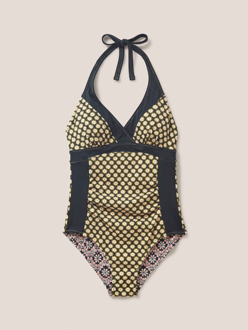 Two swimsuits in one, this printed halterneck swimsuit from White Stuff has two different graphic floral designs to show off this summer. Contrast panels sit at the sides and zig-zag stitching adds an extra pop of colour. This reversible swimsuit has two layers of Repreve® fabrication and ruching detailing on the tummy area to give support.