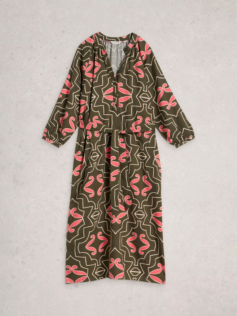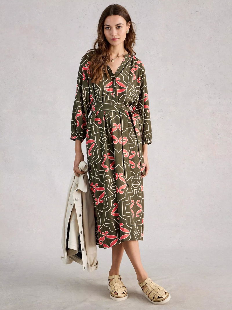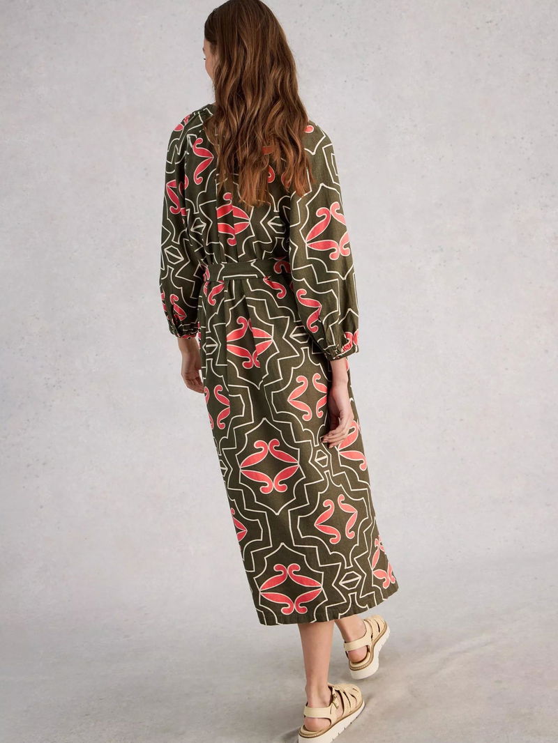 We can picture the holiday snaps already. Featuring this linen blend dress. With a tie belt at the waist, long sleeves, and a flattering notch neck.