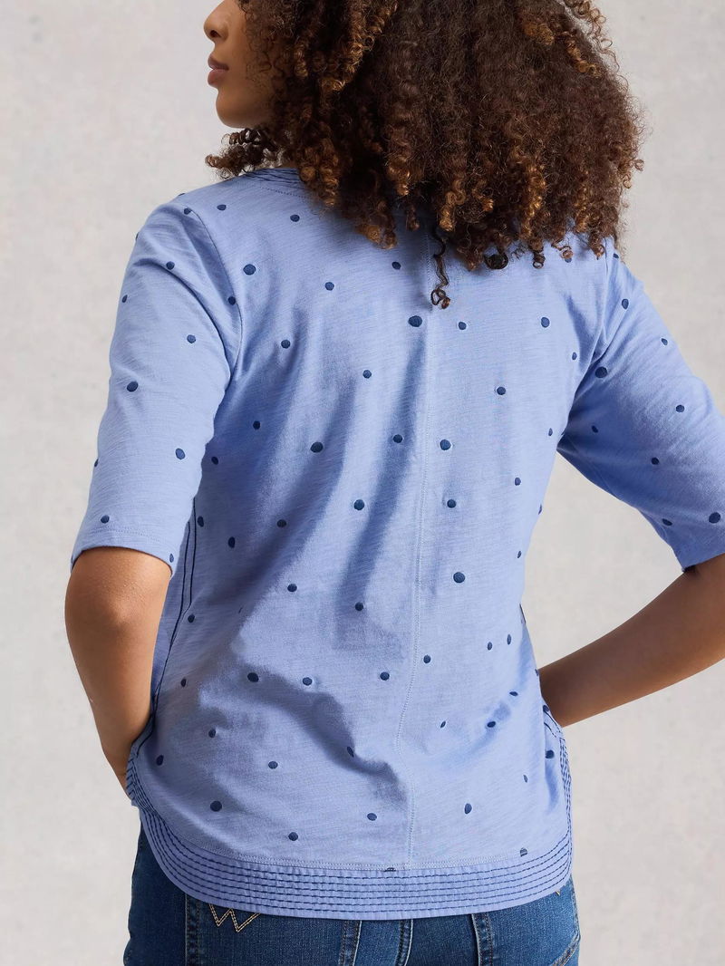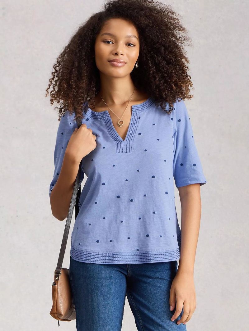 A notch neck short sleeve tee with embroidery fabric detailing down the front centre seam and around the neck.